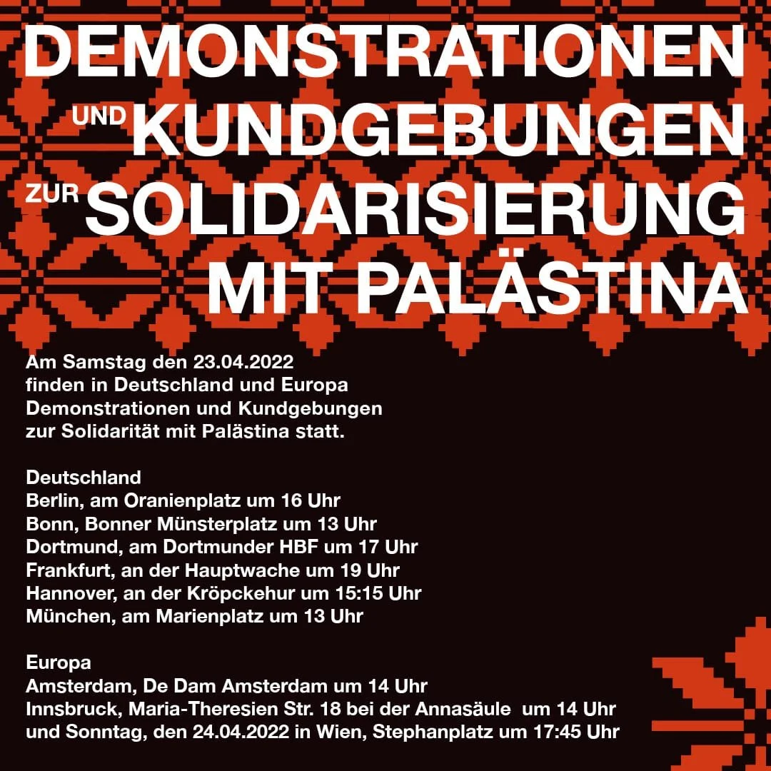 Palästina Spricht Team 23.04.22 Palästina Spricht Team 23.04.22 Demonstrationen und Kundgebungen zur Solidarisierung mit Palästina Weiterlesen
